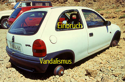 Dieses Mitauto stand auf einem einsamen Parkplatz in der Hochebene Teneriffas (Las Canadas). Die ahnungslosen Besitzer waren gerade bei der anstrengenden Wanderung auf den Teide Gipfel ;-(( Sicherer sind Parkplätze an belebten Orten z.B. vor Hotels oder Restaurants. Besonderes Augenmerk auf die Foto-/Filmausrüstung legen. |