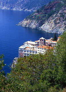 Berg Athos, "Heiliger Berg" (Hagion Oros) nennt man den östlichsten der drei Chalkidiki-Finger in Nordgriechenland. Der Heilige Berg Athos mit seinen 20 Großklöstern gehört zum UNESCO-Weltkulturerbe. Die mazedonische Halbinsel ist ca 60 km lang und 8 bis 12 km breit. An ihrer Südspitze ragt die nackte, steile Marmorpyramide des Berg Athos 2033 m aus dem tiefblauen Meer. Der Sage nach soll der Meeresgott Poseidon den riesigen Felsbrocken in einem Kampf der Giganten gegen einen thrakischen Zyklopen geschleudert und unter dem Felsen begraben haben. |